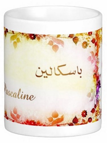 Mug avec le prénom "Pascaline" écrit en français, en arabe (باسكالين) et calligraphié de façon artistique en arabe sur la partie droite.