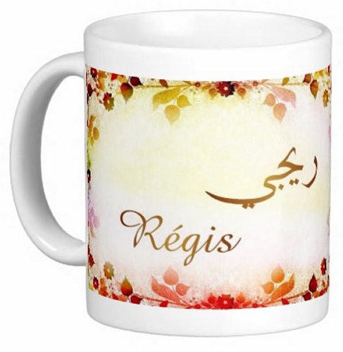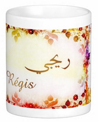 Mug avec le prénom "Régis" écrit en français, en arabe (ريجي) et calligraphié de façon artistique en arabe sur la partie droite.