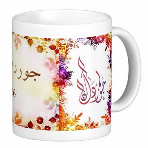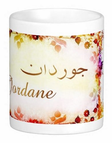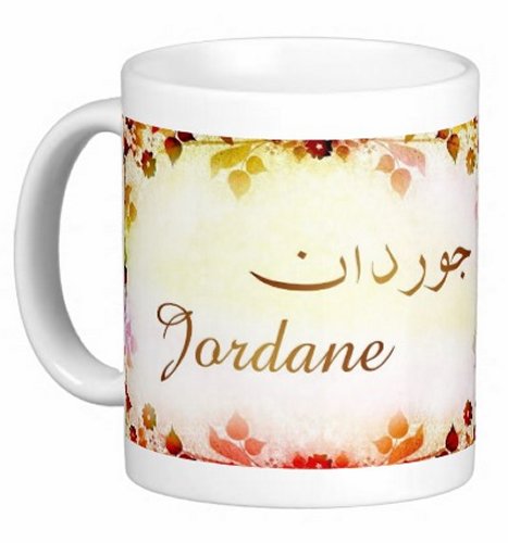 Mug avec le prénom "Jordane" écrit en français, en arabe (جوردان) et calligraphié de façon artistique en arabe sur la partie droite.