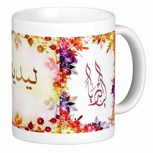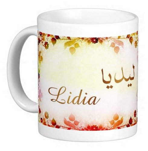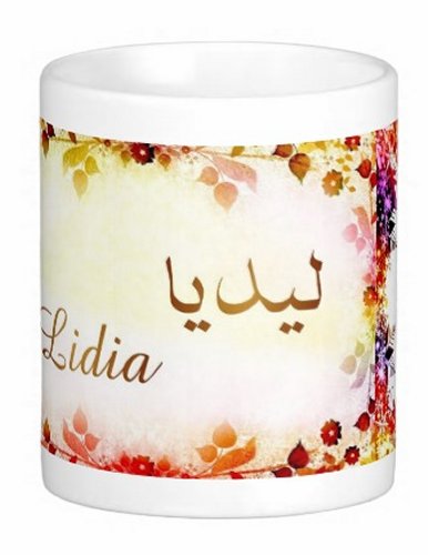 Mug avec le prénom "Lidia" écrit en français, en arabe (ليديا) et calligraphié de façon artistique en arabe sur la partie droite.