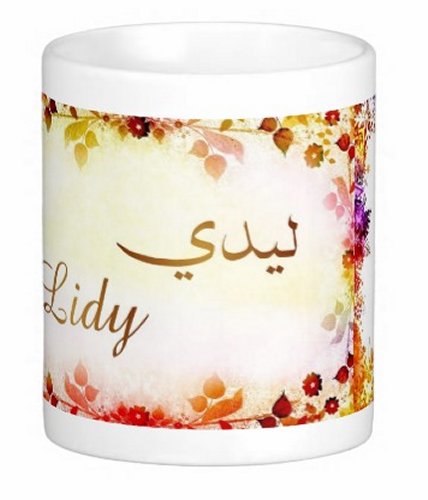 Mug avec le prénom "Lidy" écrit en français, en arabe (ليدي) et calligraphié de façon artistique en arabe sur la partie droite.