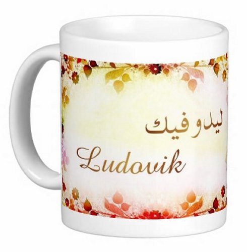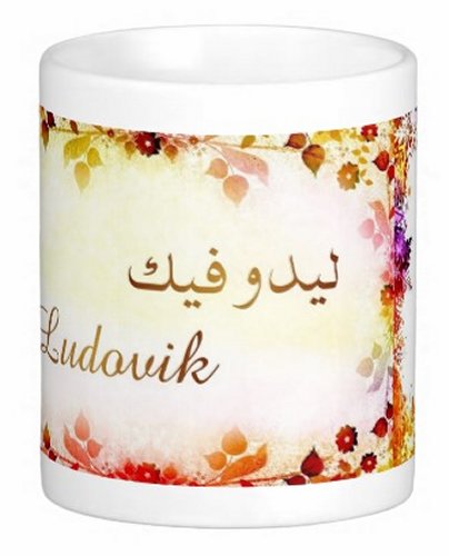 Mug avec le prénom "Ludovik" écrit en français, en arabe (ليدوفيك) et calligraphié de façon artistique en arabe sur la partie droite.