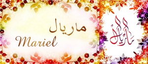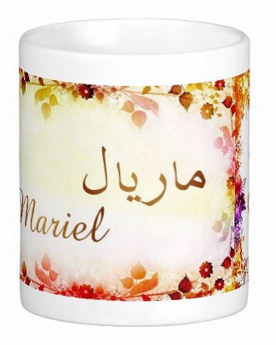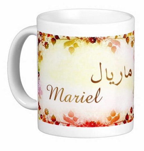 Mug avec le prénom "Mariel" (féminin ou masculin) écrit en français, en arabe (ماريال) et calligraphié de façon artistique en arabe sur la partie droite.