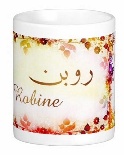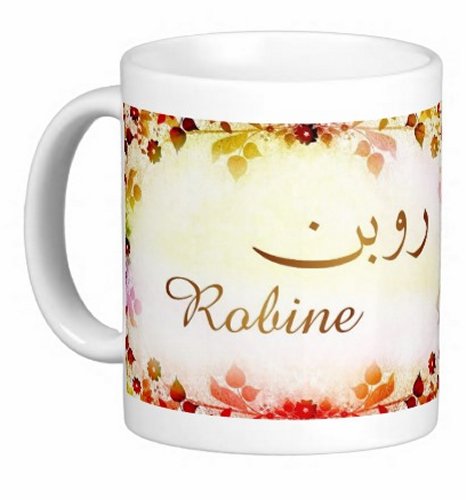 Mug avec le prénom "Robine" écrit en français, en arabe (روبن) et calligraphié de façon artistique en arabe sur la partie droite.