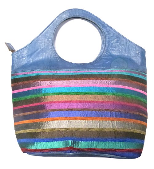 Des Couleurs estivales à porter de main... Très beau sac à main au style moderne, de grand volume, de fabrication artisanale marocaine, en cuir couleur bleue, joliment agrémenté d'une étoffe en sabra multicolore, cousue à même le cuir. Ce sac au look très chic est doté d'une doublure, d'une poche interne, ainsi qu'une fermeture éclair terminé d'une langue en cuir...