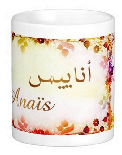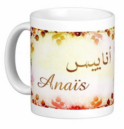 Mug avec le prénom "Anaïs" écrit en français, en arabe (أناييس) et calligraphié de façon artistique en arabe sur la partie droite.