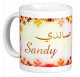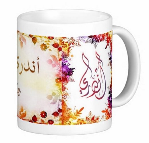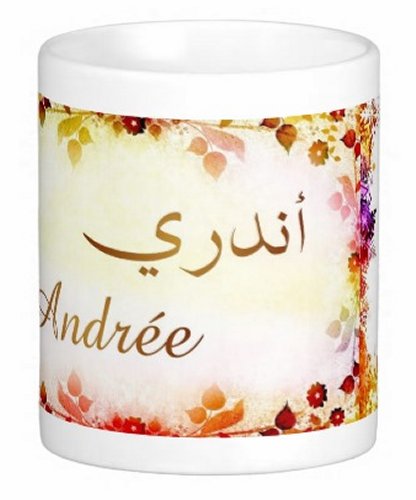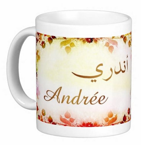 Mug avec le prénom "Andrée" écrit en français, en arabe (أندري) et calligraphié de façon artistique en arabe sur la partie droite.
