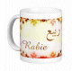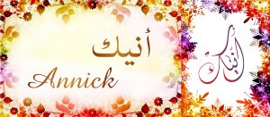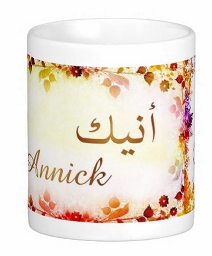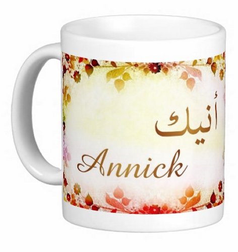 Mug avec le prénom "Annick" écrit en français, en arabe (أنيك) et calligraphié de façon artistique en arabe sur la partie droite.
