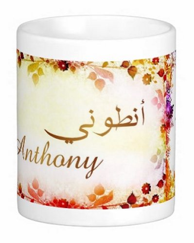 Mug avec le prénom "Anthony" écrit en français, en arabe (أنطوني) et calligraphié de façon artistique en arabe sur la partie droite.