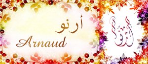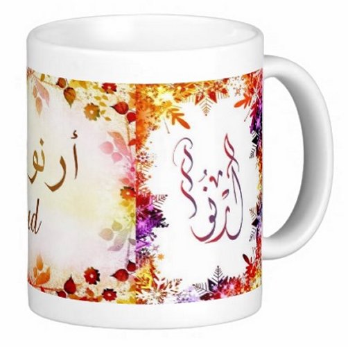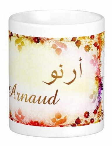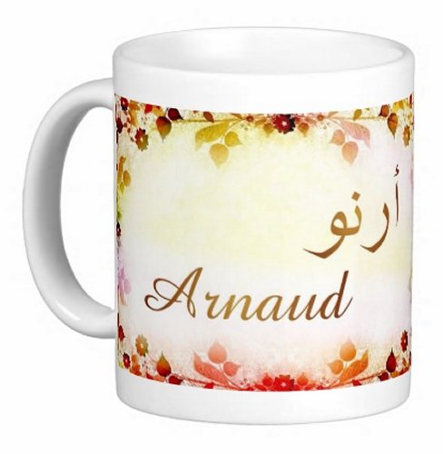 Mug avec le prénom "Arnaud" écrit en français, en arabe (أرنو) et calligraphié de façon artistique en arabe sur la partie droite.