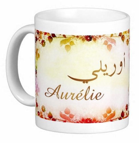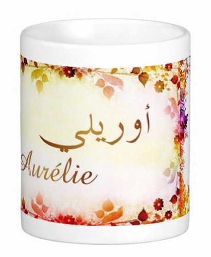 Mug avec le prénom "Aurélie" écrit en français, en arabe (أوريلي) et calligraphié de façon artistique en arabe sur la partie droite.