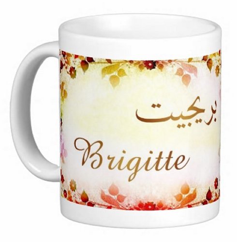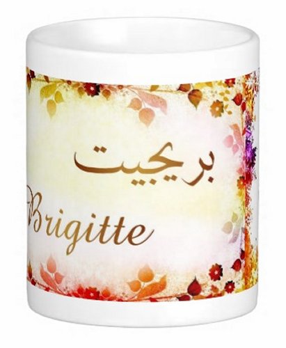 Mug avec le prénom "Brigitte" écrit en français, en arabe (بريجيت) et calligraphié de façon artistique en arabe sur la partie droite.