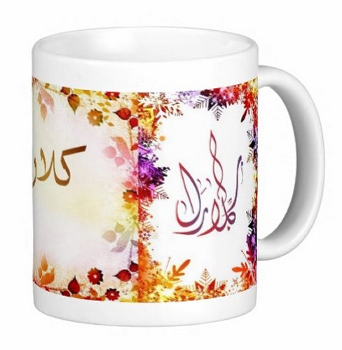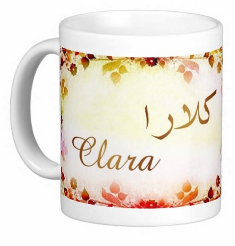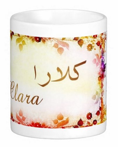 Mug avec le prénom "Clara" écrit en français, en arabe (كلارا) et calligraphié de façon artistique en arabe sur la partie droite.