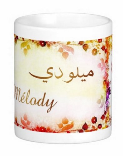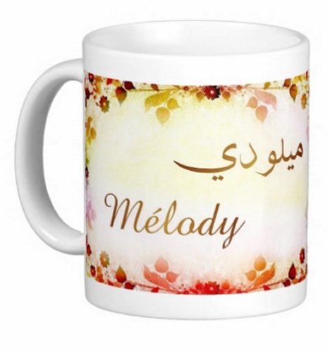 Mug avec le prénom "Mélody" écrit en français, en arabe (ميلودي) et calligraphié de façon artistique en arabe sur la partie droite.