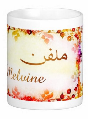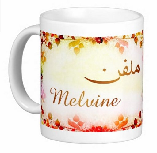 Mug avec le prénom "Melvine" écrit en français, en arabe (ملفن) et calligraphié de façon artistique en arabe sur la partie droite.