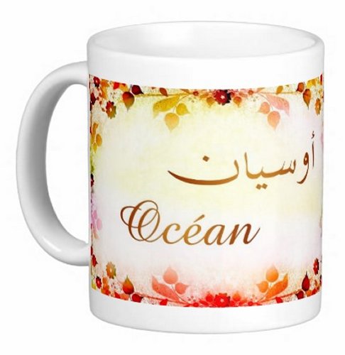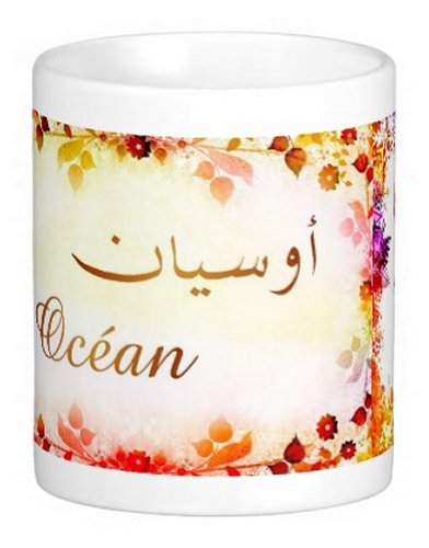 Mug avec le prénom "Océan" écrit en français, en arabe (أوسيان) et calligraphié de façon artistique en arabe sur la partie droite.