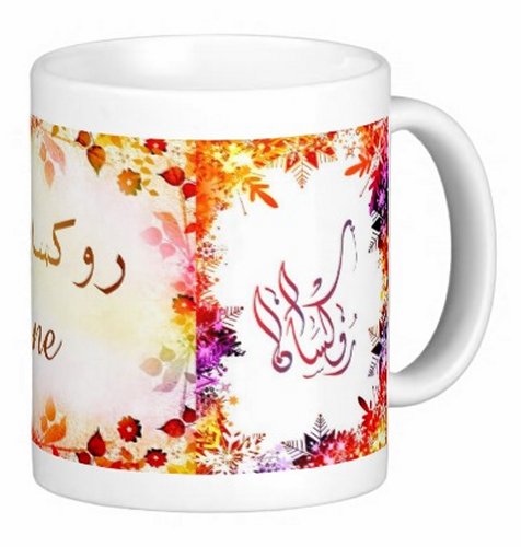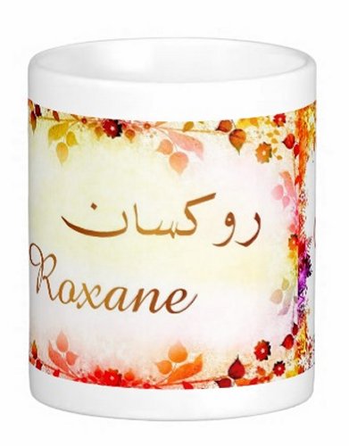 Mug avec le prénom "Roxane" écrit en français, en arabe (روكسان) et calligraphié de façon artistique en arabe sur la partie droite.