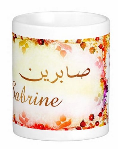 Mug avec le prénom "Sabrine" écrit en français, en arabe (صابرين) et calligraphié de façon artistique en arabe sur la partie droite.
