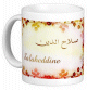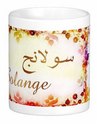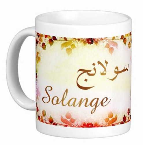 Mug avec le prénom "Solange" écrit en français, en arabe (سولانج) et calligraphié de façon artistique en arabe sur la partie droite.