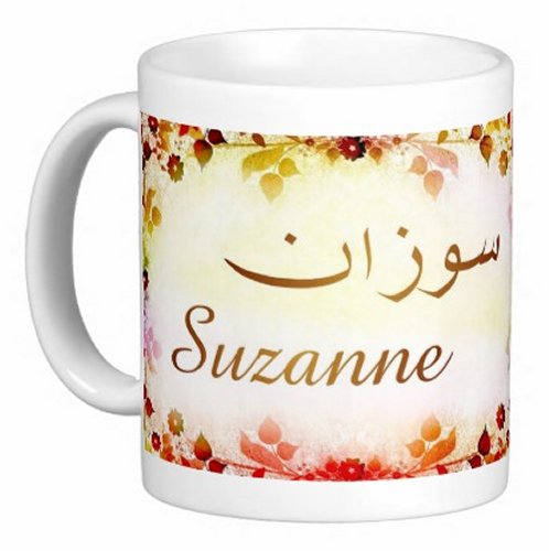 Mug avec le prénom "Suzanne" écrit en français, en arabe (سوزان) et calligraphié de façon artistique en arabe sur la partie droite.