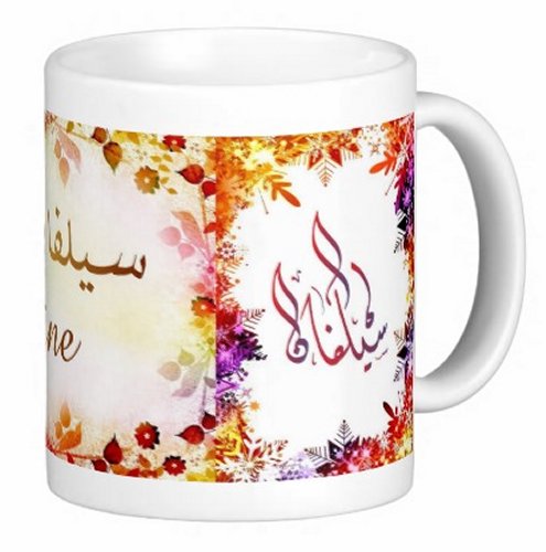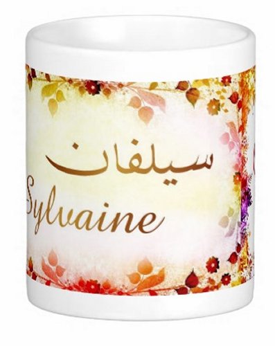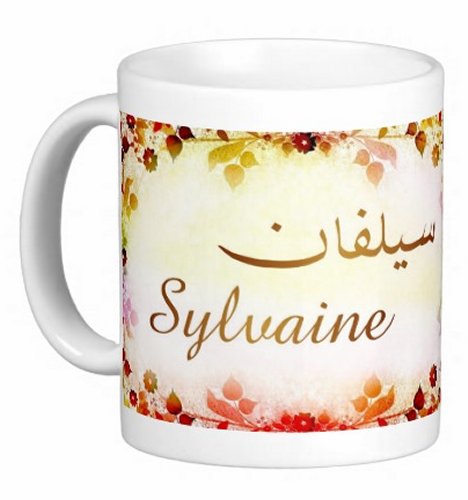 Mug avec le prénom "Sylvaine" écrit en français, en arabe (سيلفان) et calligraphié de façon artistique en arabe sur la partie droite.