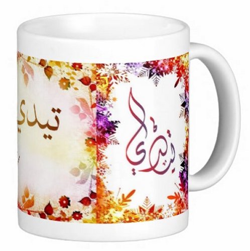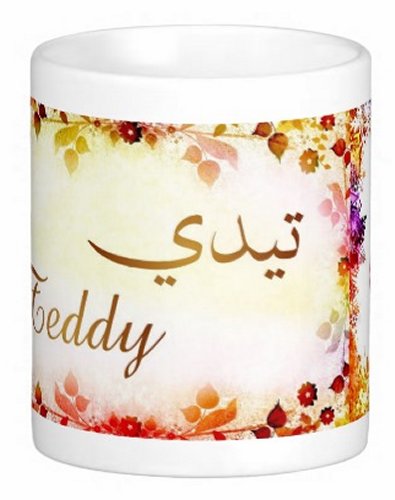 Mug avec le prénom "Teddy" écrit en français, en arabe (تيدي) et calligraphié de façon artistique en arabe sur la partie droite.