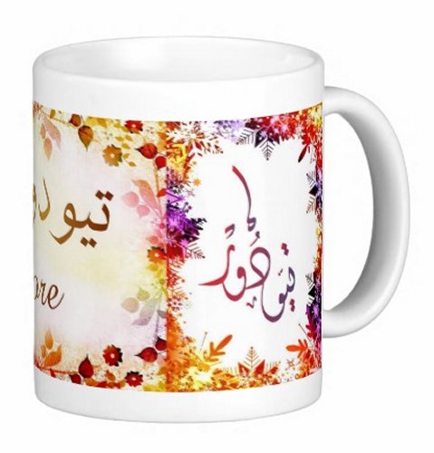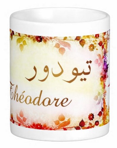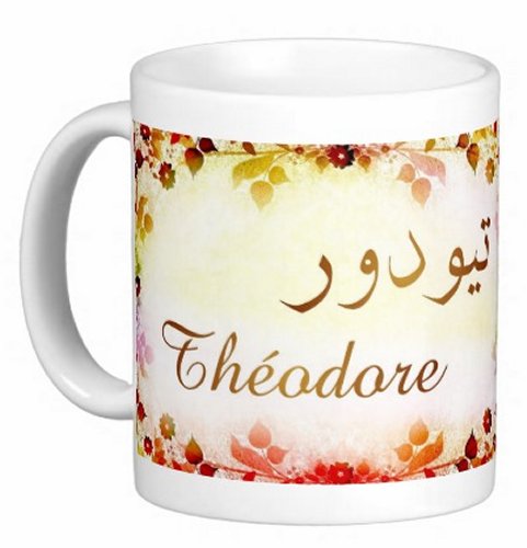 Mug avec le prénom "Théodore" écrit en français, en arabe (تيودور) et calligraphié de façon artistique en arabe sur la partie droite.