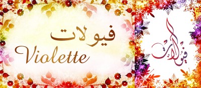Mug avec le prénom "Violette" écrit en français, en arabe (فيولات) et calligraphié de façon artistique en arabe sur la partie droite.