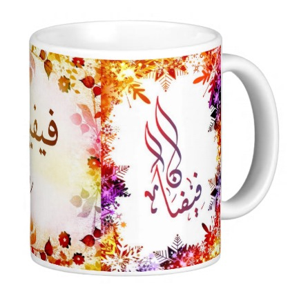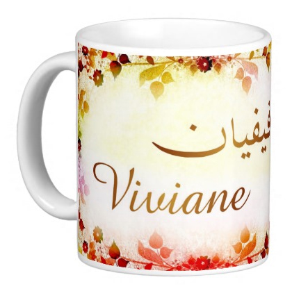 Mug avec le prénom "Viviane" écrit en français, en arabe (فيفيان) et calligraphié de façon artistique en arabe sur la partie droite.