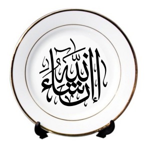 Assiette en porcelaine avec calligraphie artistique de l'expression "InchAllah" (Si Allah le veut) réalisée par un calligraphe professionnel. Cette assiette se mariera bien avec tous types de mobiliers.