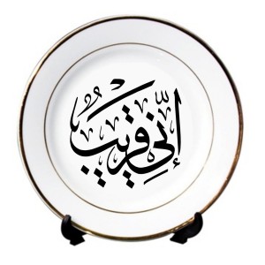Assiette en porcelaine avec calligraphie artistique de la Parole d'Allah "Innî Qarîb" (Je suis tout proche) tirée du verset n° 186 de la Sourate n°2 Al-Baqara. Cette calligraphie a été réalisée par un calligraphe professionnel.