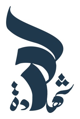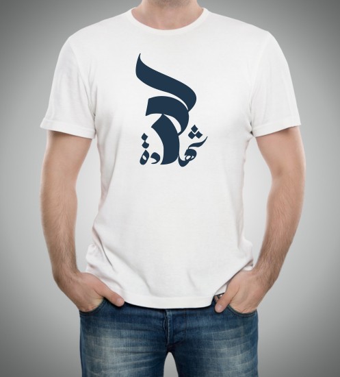 T-Shirt avec jolie calligraphie artistique de couleur bleu jean du mot arabe "Al-Chahada" qui signifie "Le Témoignage" ou "Le Martyr".