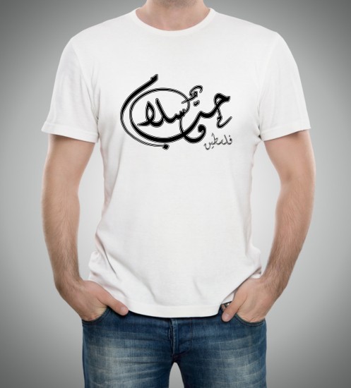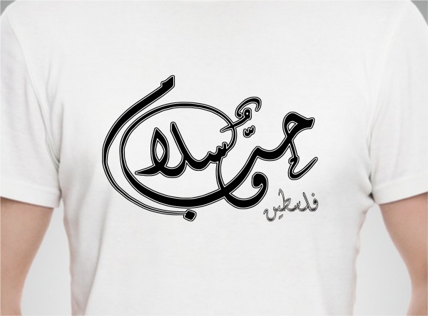 T-Shirt avec très jolie calligraphie artistique arabe "Filistîn, Hubbun wa salâm"فلسطين حُبٌّ وَسَلاَم (Palestine, Amour et paix).