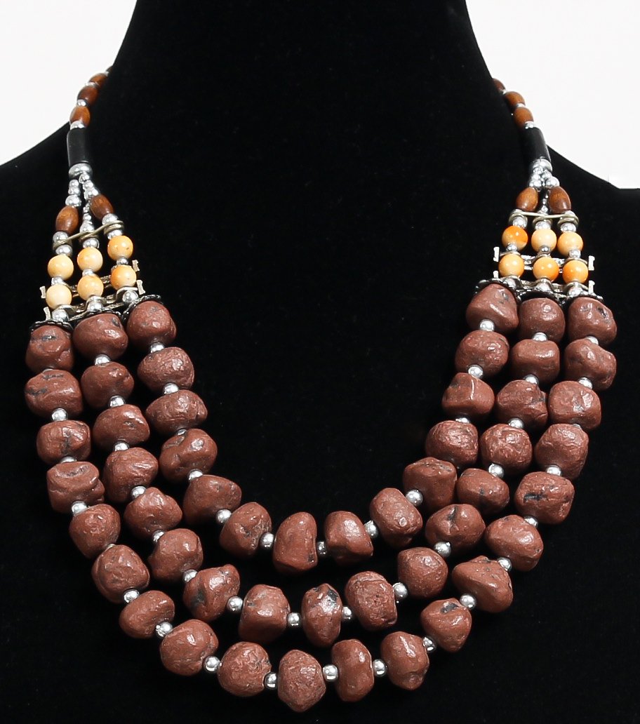 Collier ethnique artisanal trois rangs imitation pierres marrons et perles agencées de pièces argentées ciselées Vetement & Accessoire