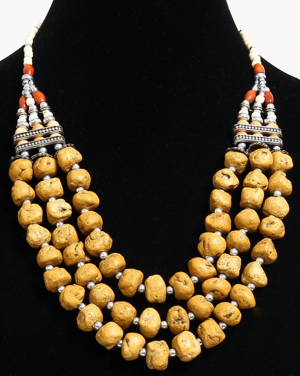 Collier ethnique artisanal trois rangs imitation pierres jaunes et perles agencées de pièces argentées ciselées Vetement & Accessoire