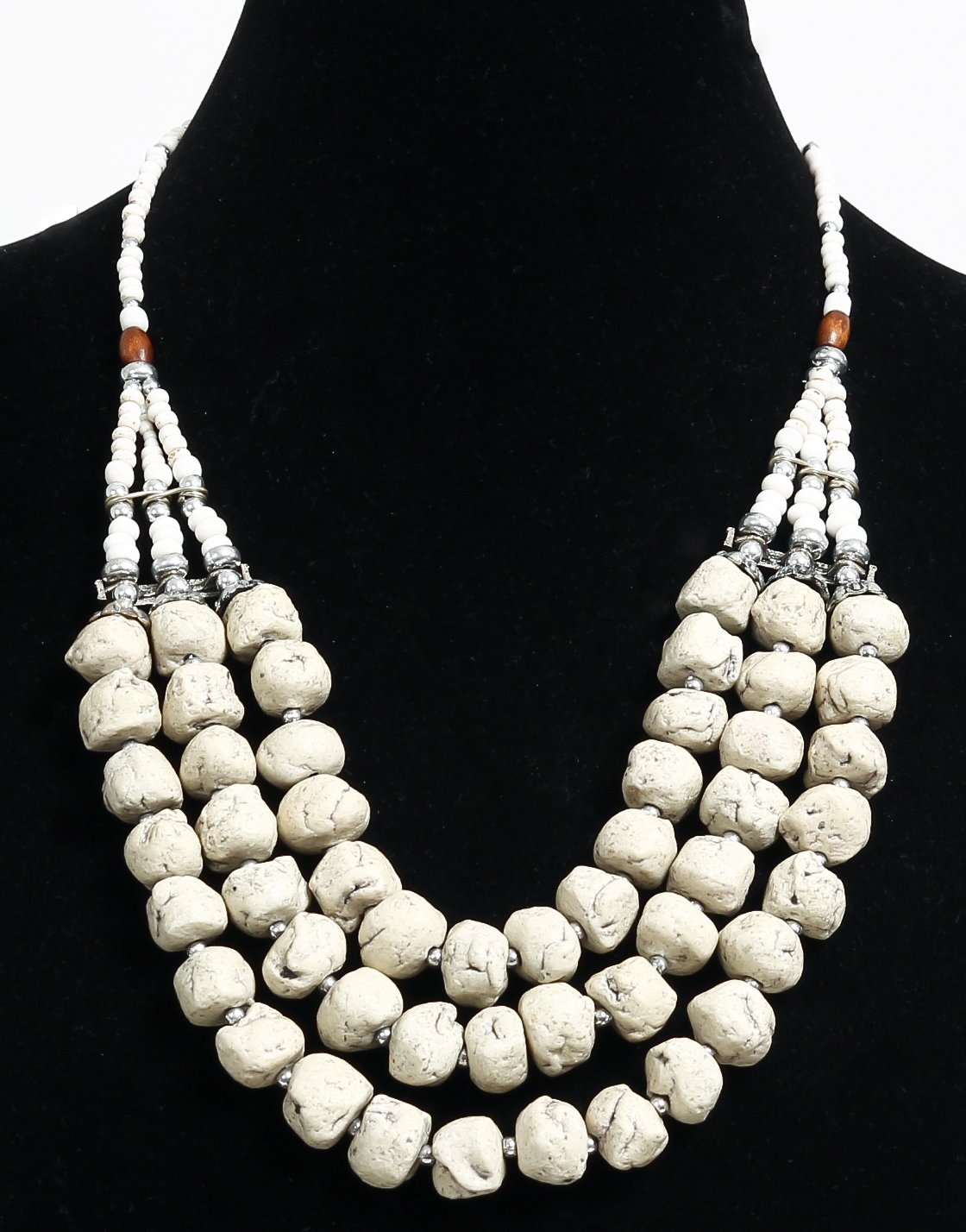 Collier ethnique artisanal trois rangs imitation pierres blanches agrémentées de perles et de pièces argentées ciselées Vetement & Accessoire