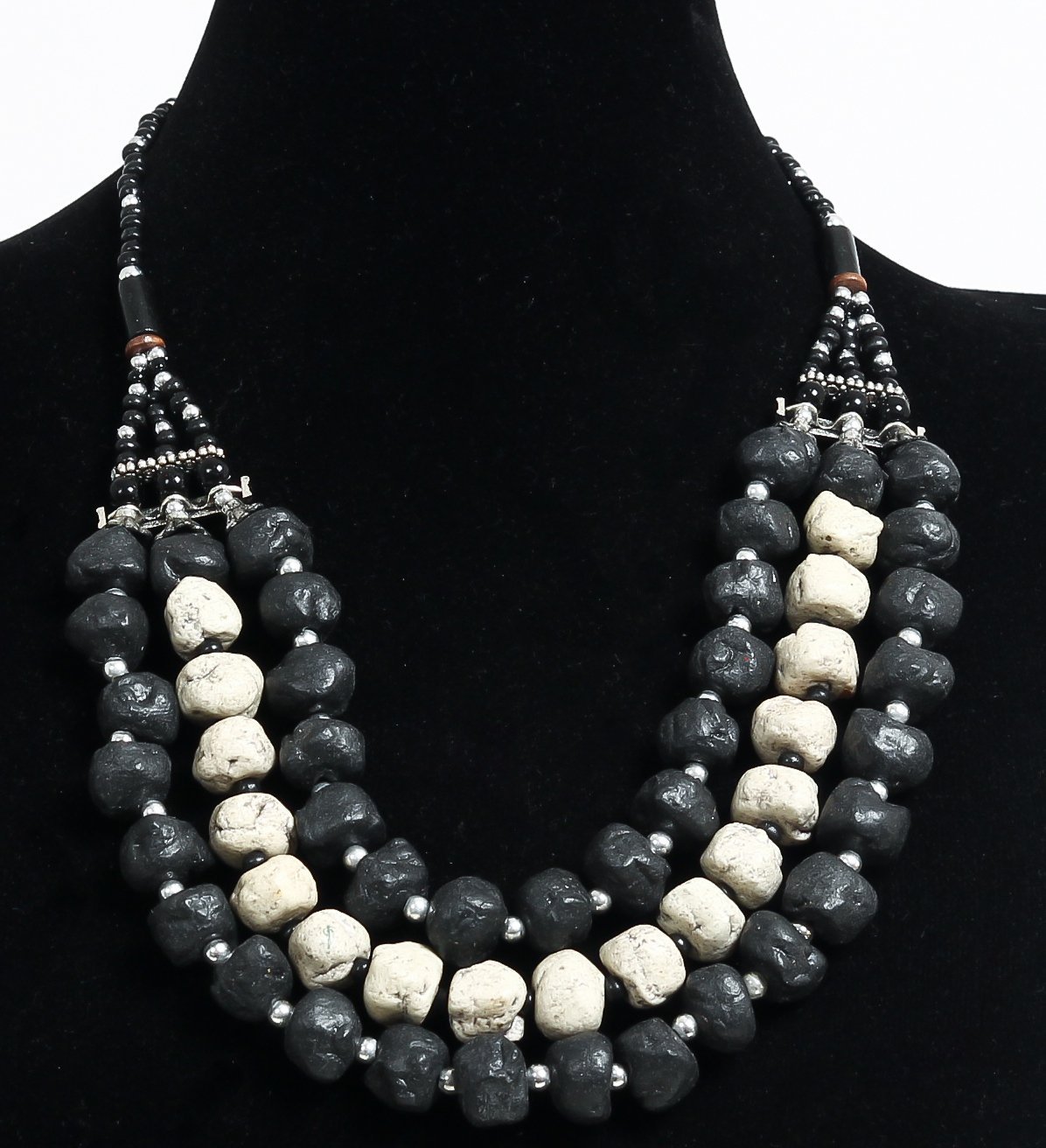 Collier ethnique artisanal trois rangs imitation pierres noires et blanches agrémentées de perles et d'armatures argentées Vetement & Accessoire