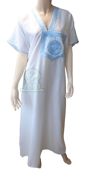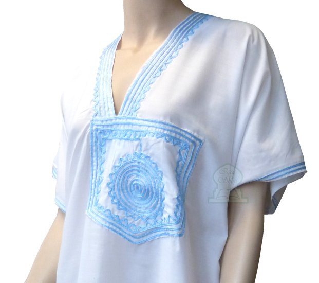 Gandoura marocaine de couleur blanche avec brodure bleue ciel et grande poche au niveau du cole - REF. 19271 (25.00 €)