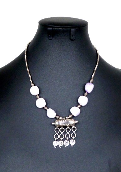 Collier artisanal marocain avec pierres blanches agremente de breloques gravees argentees