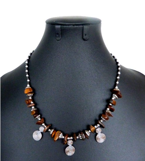 Collier artisanal marocain avec pierres marron foncé, agrémenté de petites breloques tourbillon en métal argenté Vetement & Accessoire