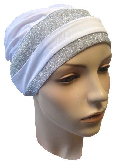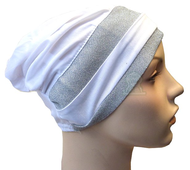 Bonnet blanc avec deux bandes paillettes grises. Composition 35% coton 65% polyester.