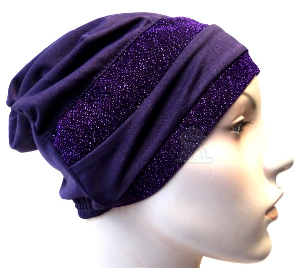 Bonnet mauve foncé avec deux bandes paillettes de couleur aubergine. Composition 35% coton 65 polyester.
