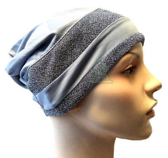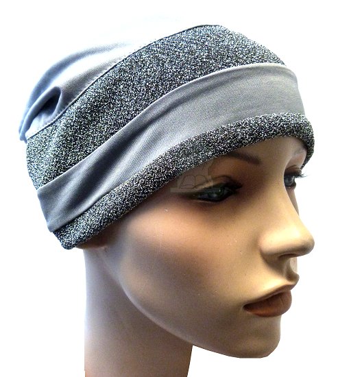 Bonnet gris en coton avec 2 bandes paillettes en gris foncé. Composition 35% coton 65 polyester.