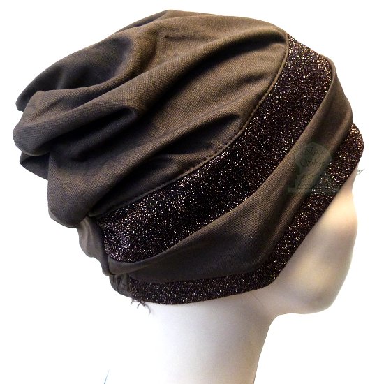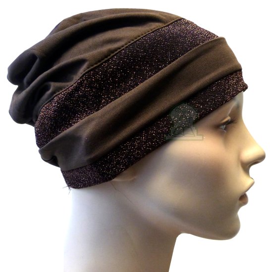 Bonnet marron avec deux bandes paillettes brillantes marron foncé. Composition 35% coton 65 polyester.