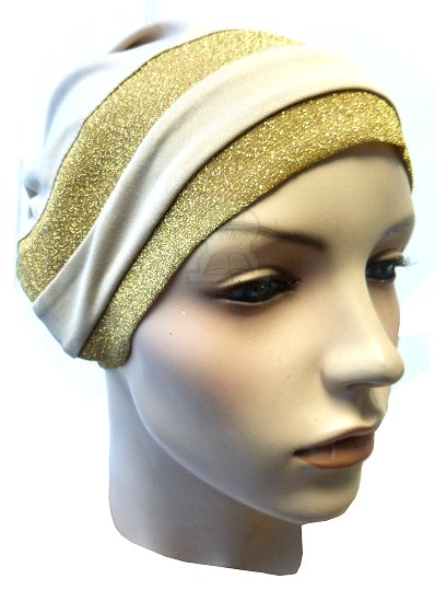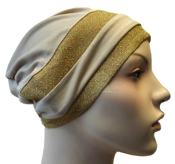 Bonnet beige avec deux bandes paillettes dorées - REF. 19624 (3.50 €)