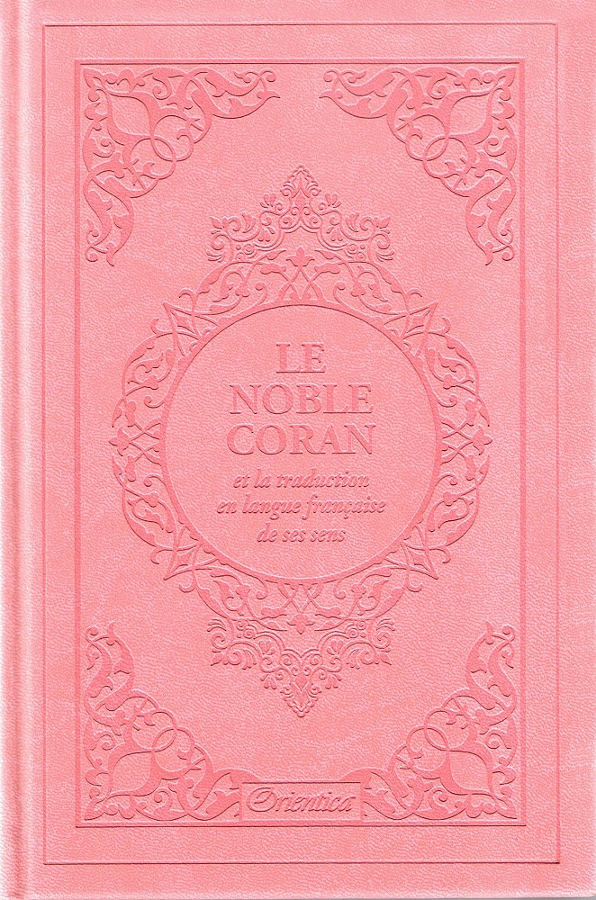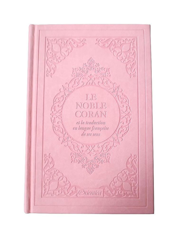 Le Noble Coran avec couverture cartonnée de type cuir, doux au toucher. Très jolie couleur féminine tirant vers le rose clair. Idéal pour offrir.