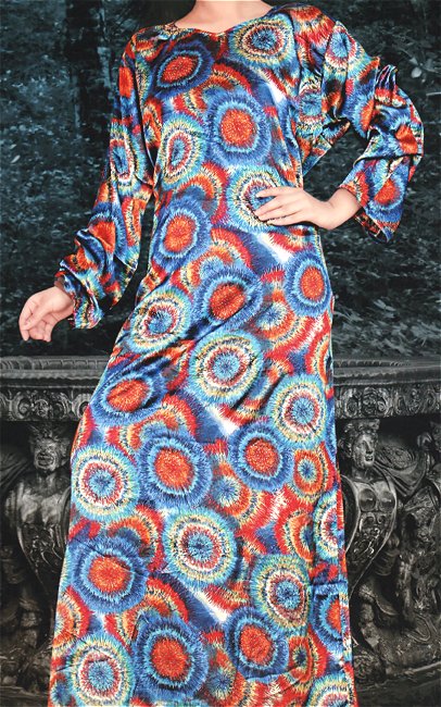 Robe orientale d'été satinée avec motifs fleuris circulaires assortis de strass ici et là et col V.
