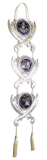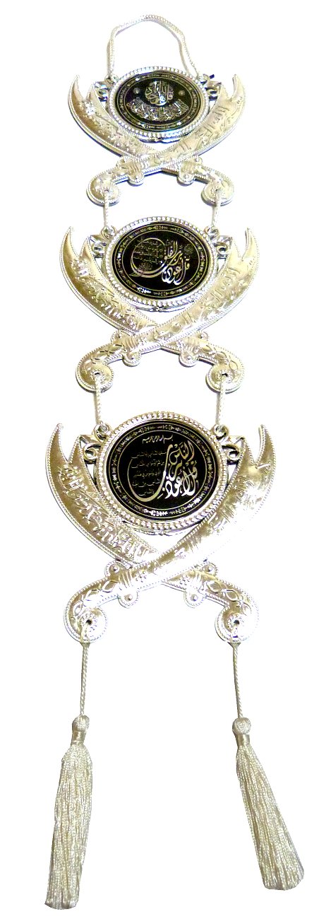 Décoration islamique argentée avec pompon en 3 parties contenant des inscriptions islamiques en arabe (Sourates, verset du Trône...) - REF. 20294 (7.50 €)