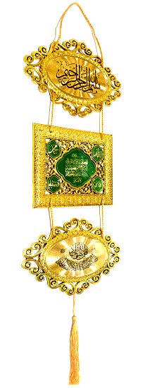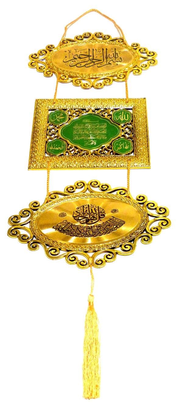 Les éléments du tableau contiennent les inscriptions suivantes : la basmalah (Au nom d’Allah, le Tout Miséricordieux, le Très Miséricordieux) ,sourate al-Fatiha et sourate al-Ikhlass (la sincérité).