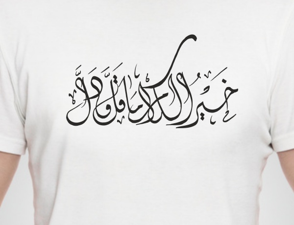 T-Shirt avec très jolie calligraphie artistique de l'expression arabe qui signifie : Les discours les meilleurs sont les plus brefs... (Khayroul Kalâmi Mâ Qalla Wa-dal)
